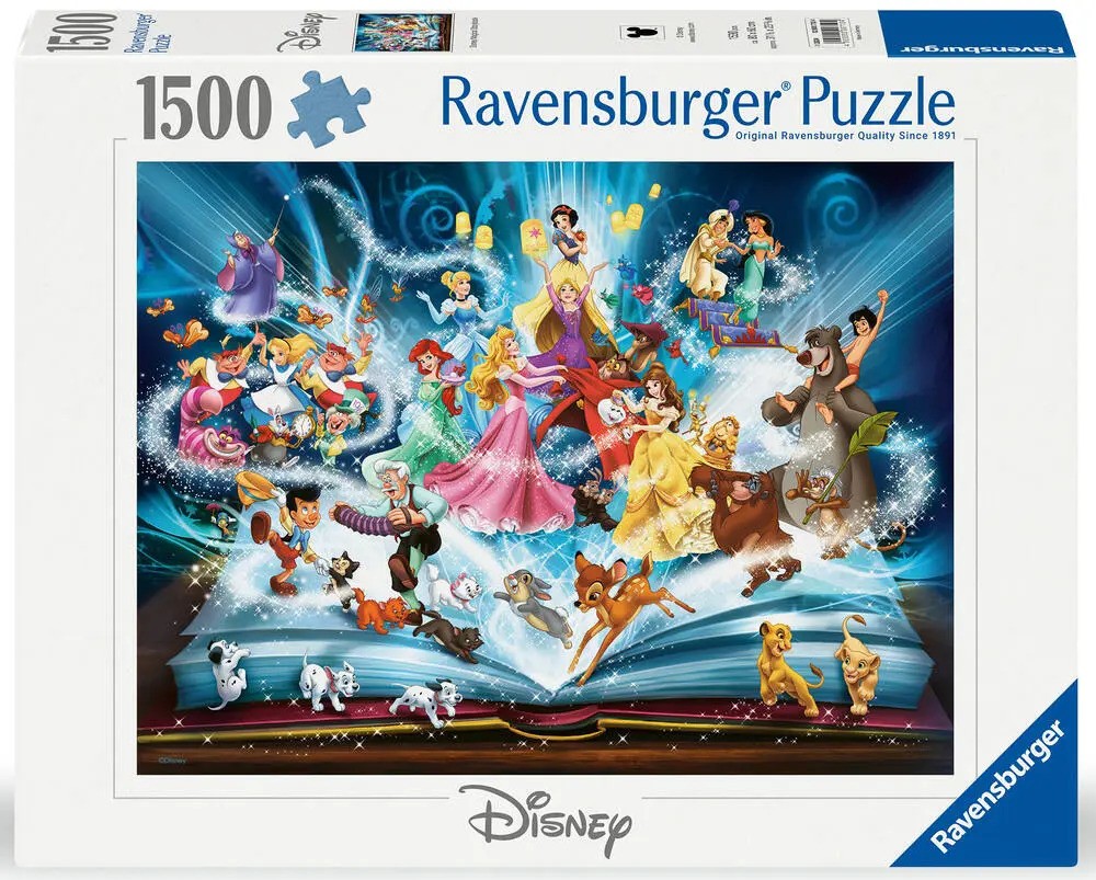 This beautiful puzzle depicts characters from 14 of Disney's most iconic films. Cinderella's Fairy Godmother waves her magic wand and brings characters to life from the pages of a book. How many famous characters can you name? There's Cinderella, Alice, Pinocchio, Bambi, Simba, Baloo, Jasmine, Belle, Aurora, Ariel, Rapunzel, Snow White, cuties from 101 Dalmatians and The Aristocats, all shown against an enchanting background of stars and glowing lanterns. A "must have" for all Disney fans!