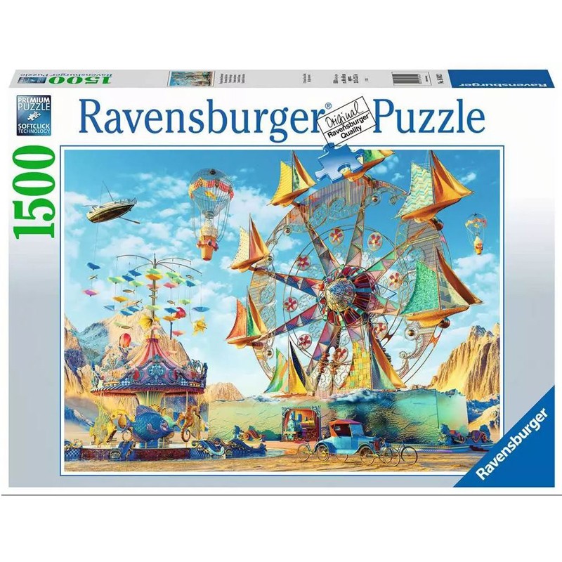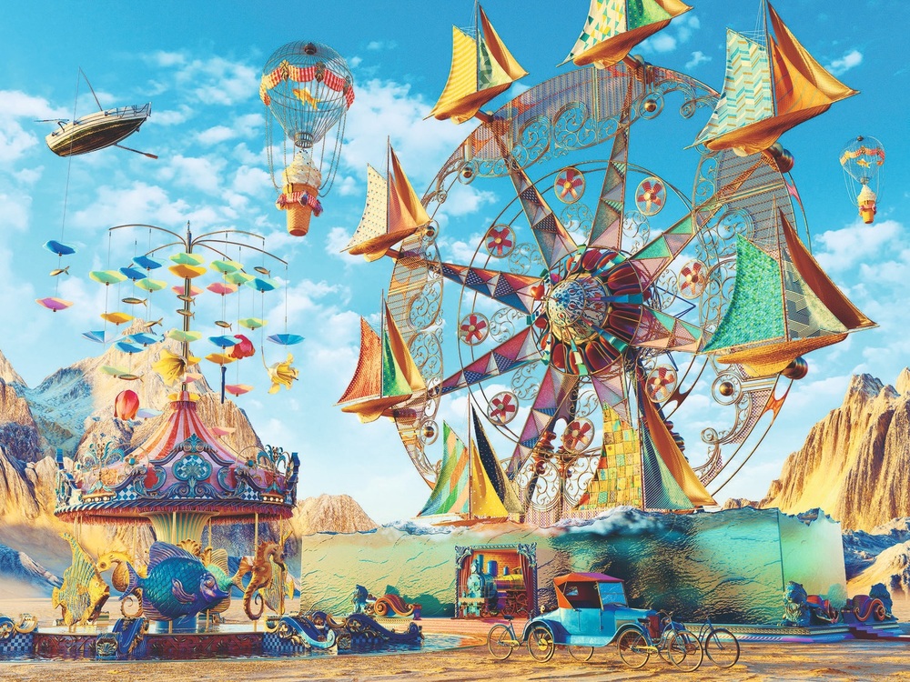 Imagine floating in a boat high above the ground, with not a drop of water to be found! Except there’s water beneath the Ferris wheel of sailing ships, rising in the air before they pause, then dip. But it’s dry among the merry-go-round’s fantastic fish, where just a thought creates your every wish. A surrealistic illustration full of creativity and fun — a puzzle sure to bring you joy from the first piece ‘til you’re done!