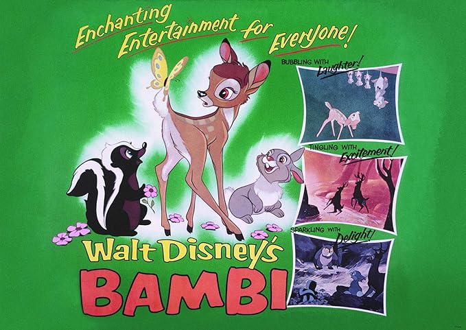 One of the first conservation-awareness movies made, a real break-through in Disney animation came when animator Marc Davis studied a book on baby behavior and endowed the animals in Bambi with a range of human facial expressions. The impressionistic art styling of the backgrounds rendered by Chinese American artist Tyrus Wong prompted a reporter to note, “Reviewers will hesitate to describe Bambi as a cartoon… It is more like a fine painting.”
