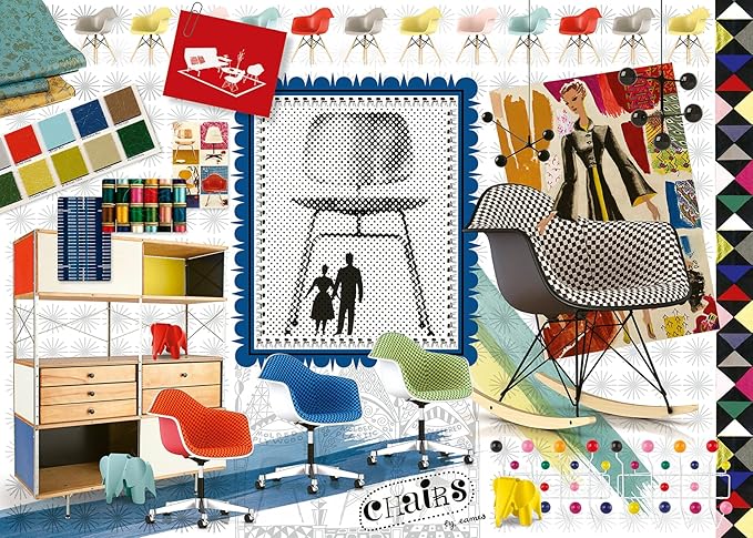 Feel your creative juices flow as you piece together this homage to amazing artistry! Charles and Ray Eames, the titans of modern furniture design, saw the need for a versatile chair to welcome bodies of all shapes and sizes, and the Shell Chair was born! Myriad choices of bases, seat colors and materials add up to more than 2 million unique combinations. With the Hang-It-All rack, Sea Things fabric pattern, new lighting and more, you’re sure to enjoy a perfectly-designed puzzle experience!