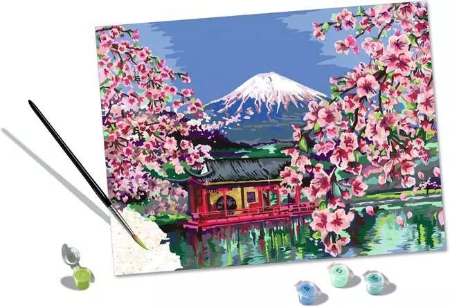 Challenge your inner artist to climb higher as you paint Mt. Fuji and beautiful “Japanese Cherry Blossom” with the CreArt Painting by Numbers set!