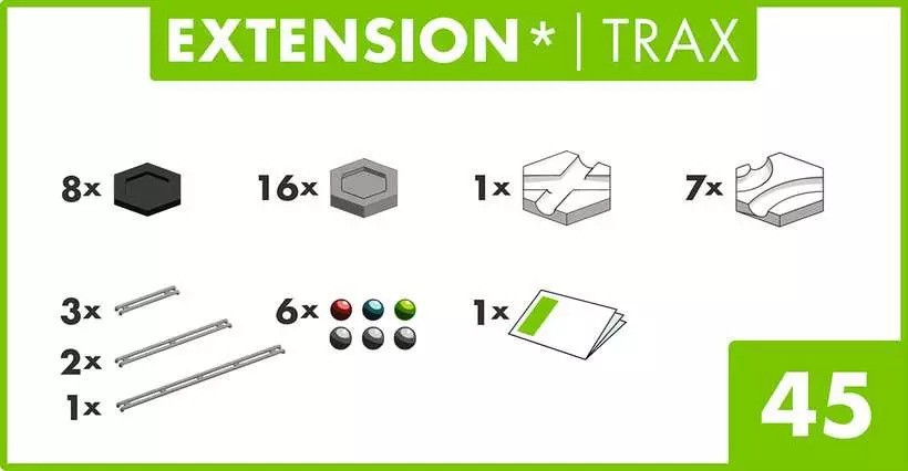 The Extension Trax contains many different basic components and 6 balls to extend the ball track. Combined with any GraviTrax starter set, the Extension Trax brings even more variety and ball fun to the GraviTrax universe. How much longer can the ball roll with the new elements?