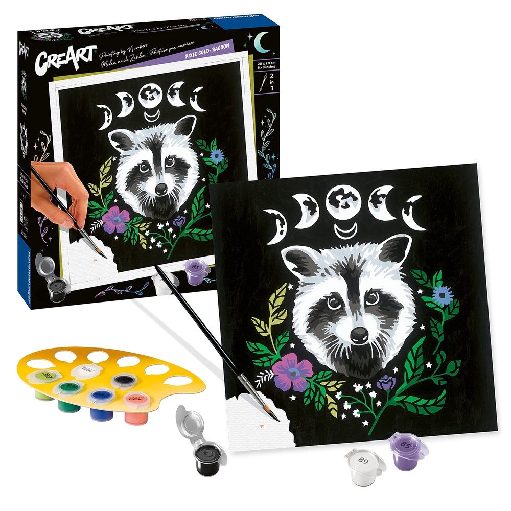 Escape into the harmony of the nature kingdom for hours of relaxing calm with our “Pixie Cold: Raccoon” CreArt Painting by Numbers set!