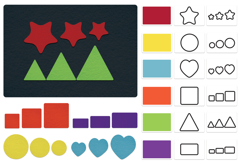 - 18 color, shape, and sequence cards (4”x6”, 10x15cm)