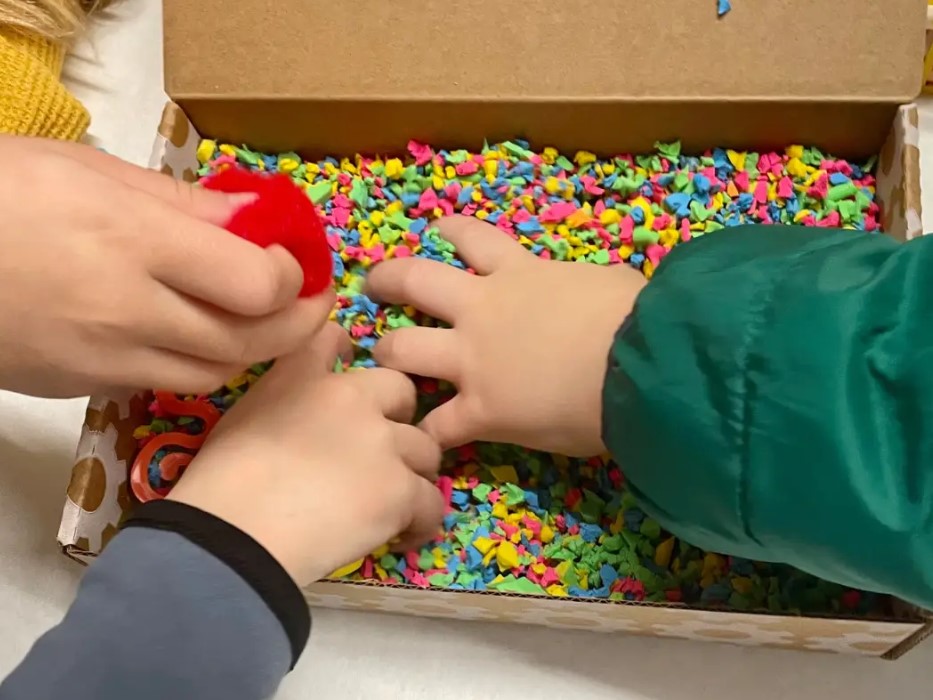 Create a table-top sensory exploration box full of textures for touching and squishing! Designed to promote sensory awareness, relaxation, and creative thinking.