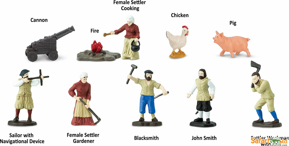 - 10 figures: a sailor with a navigational device, a female gardener, a blacksmith, a settler workman, a female settler cooking, and John Smith, as well as a chicken, pig, and a cannon.