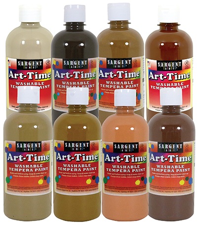 Assortment of these multicultural, tempera paints includes 8 colors: beige, olive, terracotta, tan, peach, brown, mahogany, and bronze. It washes from most fabrics and skin with soap & water. These paints come in clear bottles with convenient flip-top caps. They are Non-Toxic & AP Certified.