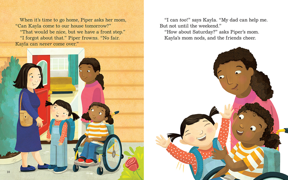 But the house has a front step, so Kayla can only come on the weekend when her dad can help her get inside. With new adventures in each other’s homes, the girls’ friendship blooms.
