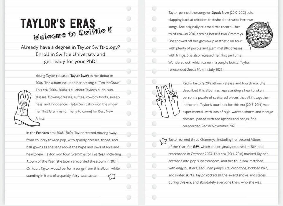 It’s all inside this book: Taylor’s love stories, her fame, her reputation, her tours, and her friends and fans. Plus, you’ll discover all Taylor’s faves — foods, fan moments, lyrics, fellow musicians, and much more — now and in every era!