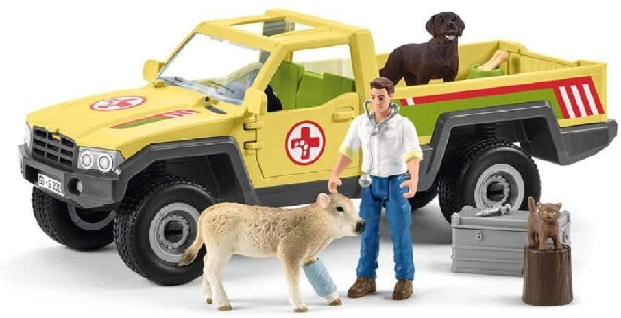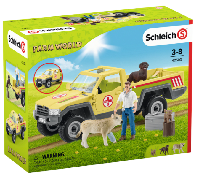 - Expansion set for the veterinary practice with pets from the Schleich Farm World. The vet needs to hurry! A calf on the farm is in urgent need of treatment. He jumps in his pickup and rushes to help!