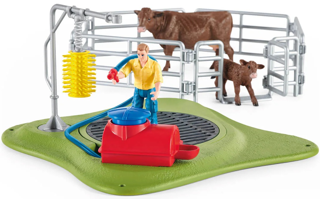 - 1x farmer, 1x cow, 1x calf, 1x pitchfork, 1x hay, 5x pasture fence, 1x gate, 1x cow brush, 1x cow brush holder, 1x bar, 1x base plate with turntable, 1x hose, 1x water pump with spray function