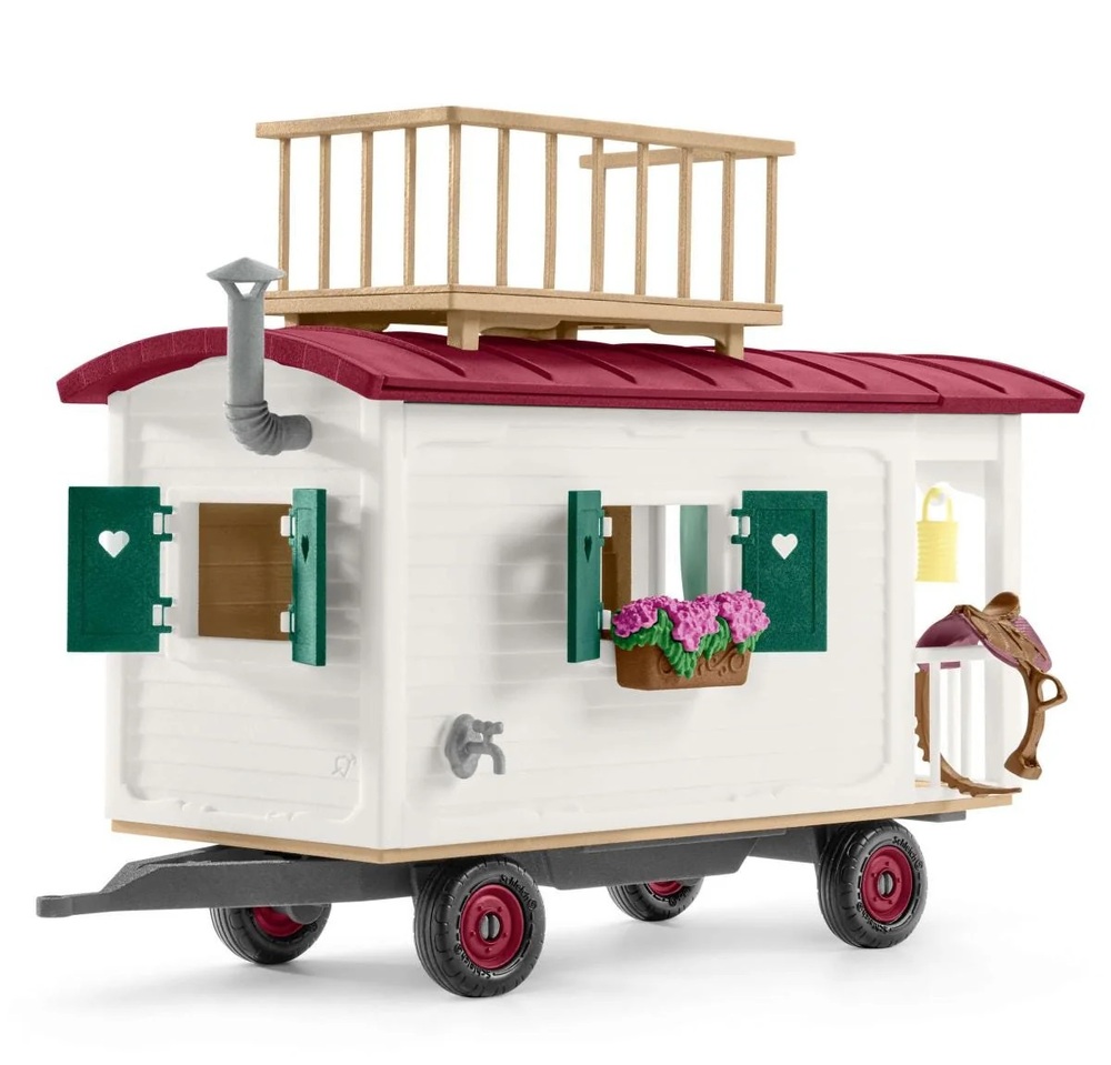 - 1x girl, 1x Andalusian mare, 1x squirrel, 1x caravan, 2x lanterns, 1x ladder, 1x chair, 1x parasol, 1x terrace table, 1x sofa, 1x coffee table, 1x lamp, 1x flower box, 1x rope ladder, 2x victory ribbons, 1x saddle, 1x bridle, 1x reins, 1x halter, 1x feeding rack, 1x curry comb, 1x grooming brush, 1x straw bale, 1x bucket, 1x apples, 2x pillows, 1x campfire, 1x bottle, 2x barbecue skewers with sausage, 2x cups, 2x mugs, 1x key, 1x pot plant, 3x logs,1x sticker, 1x English Thoroughbred mare, 1x English Thoroughbred stallion, 1x English Thoroughbred foal, 4x paddock, 1x feeding rack, 1x apples, 1x obstacle, 1x winner's trophy, 1x assembly instructions