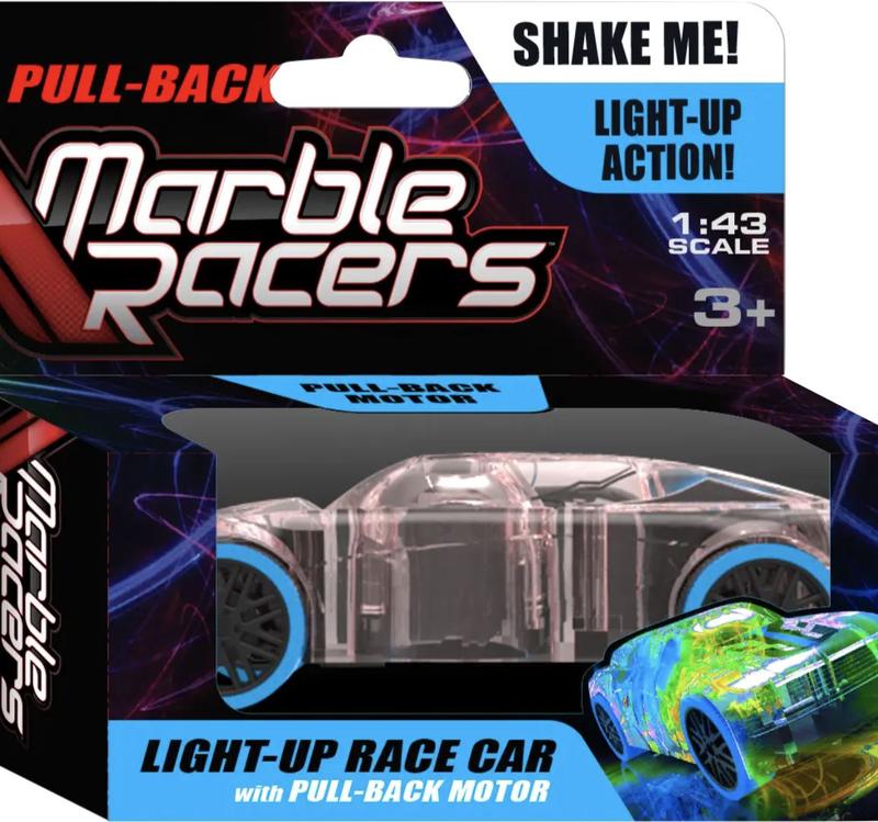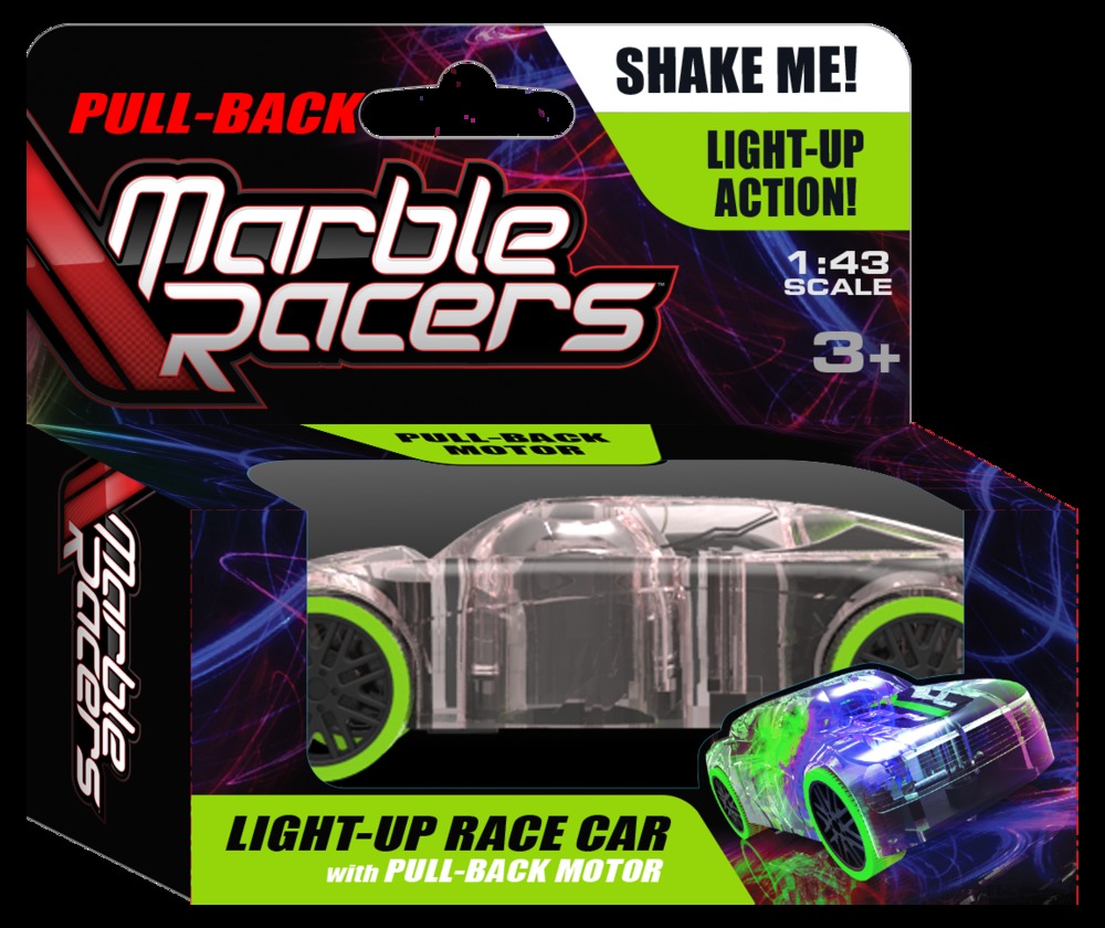 Light Up Marble Racers combine the racing excitement of mini-toy sports cars and the classic amusement of marbles to create a fun new toy for boys and girls 3 years of age and older. Kids customize their Marble Racers with themed, easy to use, crack & peel racing decals, race their creations on standard tracks, and then watch as the flashing LED marble rolls to keep pace with their speeding car.