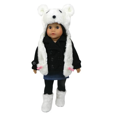 Everyone's wearing warm winter hats and now your American Girl can too. This White Furry Polar Bear Hat has small round ears, and black eyes and nose. The ties are really long hand pockets and are fashioned with pink bows. Fits most 18 inch dolls like American Girl®, Sophia's, Journey, Springfield and Madame Alexander.