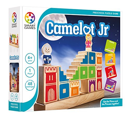 Arrange beautiful hardwood towers and stairs to create the path for a knight and his princess to be reunited! The knight and princess can only walk up stairways or along the top of walls. They cannot jump down or climb up walls. Camelot Jr gives children and their (grand)parents hours of brain-challenging fun!