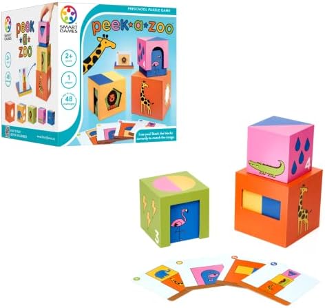 Can you spy with your little eyes which animals go together? Choose your challenge out of 48 cards and see if you can stack the five cardboard blocks in the right order, according to the card. See your zoo friends come to life as you practice language skills and learn about colours and animals. Includes a leaflet that has all the possible solutions. For 1 player.