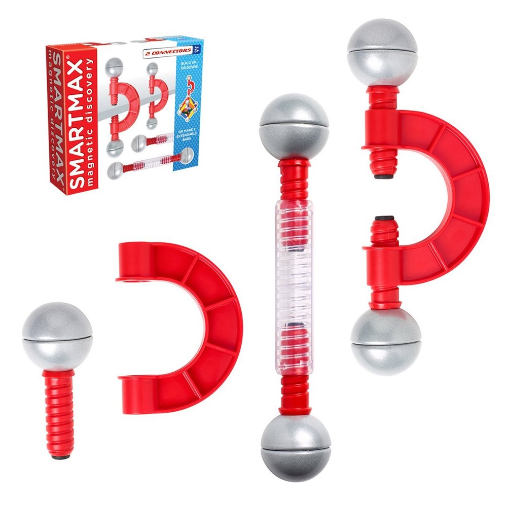 Exponentially increase your building options with this special SmartMax extension set. New connector pieces can be attached to any structure with a thickness of up to 2 inches, allowing both "up" and "down" building. Included with each connector is an expandable long bar/ball combo. Expandable bars are perfect for when SmartMax creations need a little more length. Set includes both two connectors and two expandable bars for added length. SmartMax enables young children to explore magnetism safely, with strong, oversized pieces that are specifically designed for handling by young kids. SmartMax products are safe and durable, made from the highest quality materials. Our magnets are incredibly strong, able to carry up to 60 times their own weight! SmartMax magnetic bars feature unique color codes: "Cold"-colored bars (blue, green, purple) attract "warm" colored bars (red, orange, yellow). Warm-colored bars repel other warm-colored bars, cold-colored bars repel other cold-colored bars. SmartMax products include complete, colorful guides with both product information and sample designs. All parts can be combined with all existing SMARTMAX® sets, creating an endless range of possibilities!