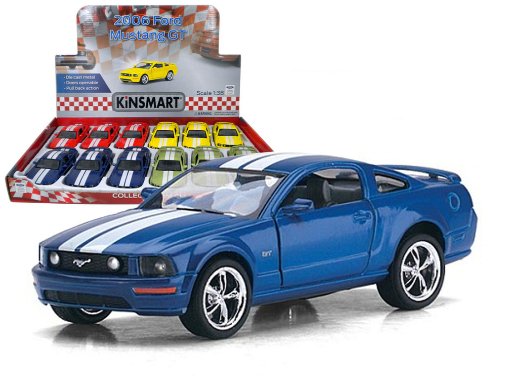 1:38 scale diecast collectible model car. This 2006 Ford Mustang GT with racing stripe is a 5" long die cast metal car with pullback motor action, opening doors.