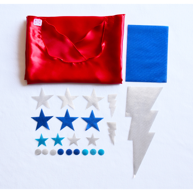 Create your own, no sew, superhero cape with this easy to make cape kit. The kit includes a red 22" sidekick cape and a variety of iron on emblems to make your very own custom superhero cape. Get as creative as you want to be!