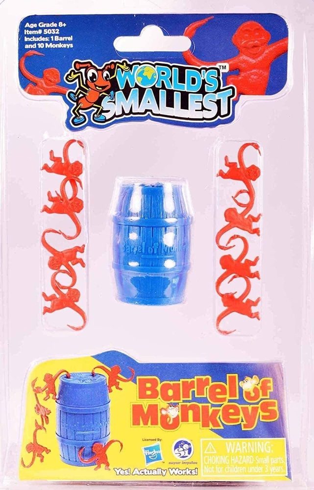A miniature edition of the Hasbro childhood favorite since 1965, Barrel of Monkeys