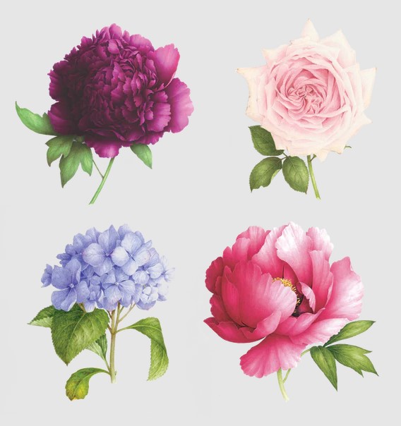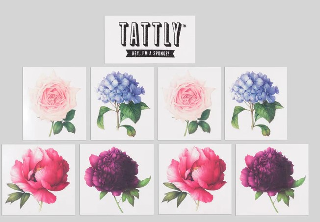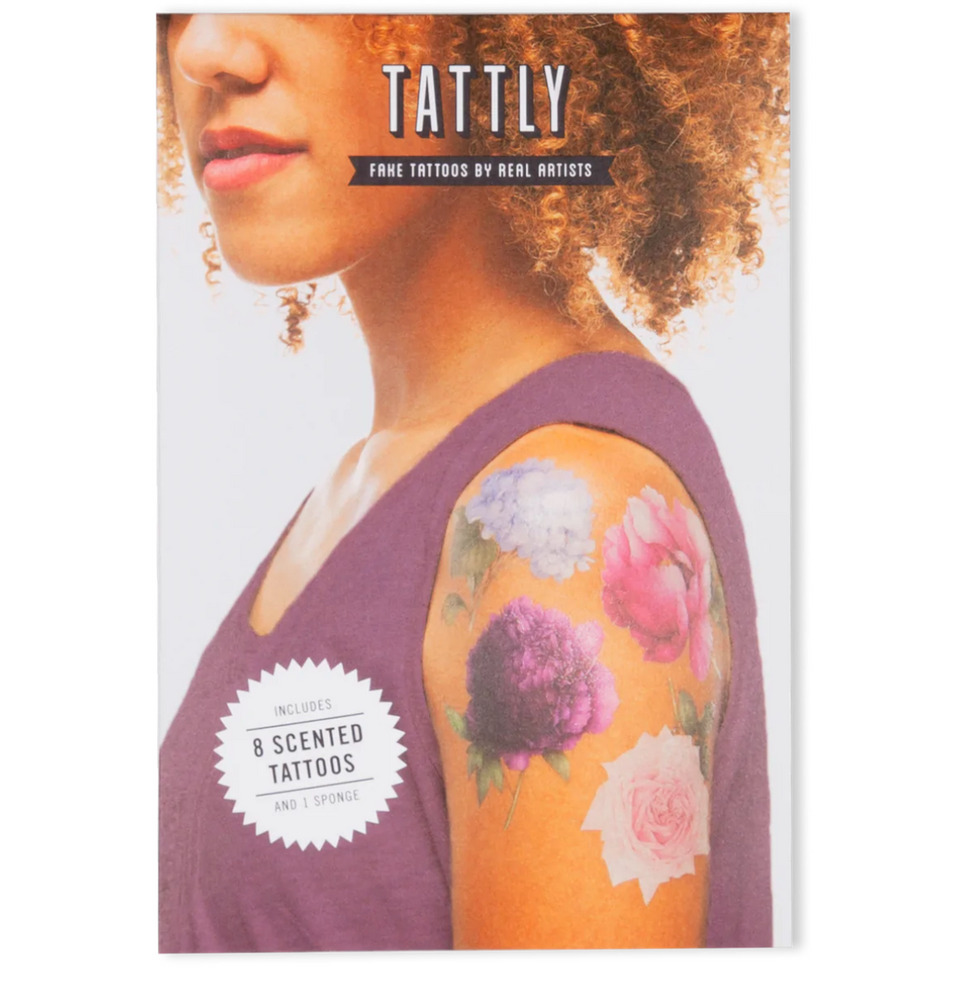 Tattly tattoos are safe and non-toxic, lasting on average 2-4 days. We suggest placing on oil-free areas where skin does not stretch and keep them clean! The Perennial Set by Vincent Jeannerot is Tattly's first set of scented temporary tattoos. The unique fragrance was created in collaboration with Agilex Fragrances, and includes notes of Dewy Fuchsia Petals, Pink Poppies, Ylang Ylang, and Poplar Wood. The scent complements the colors and textures of Jeannerot's original watercolor artwork, and we couldn't love them amore than we already do! The Perennial Set includes Blue Hydrangea, Pink Peony, Purple Peony, and Rose La France. ~