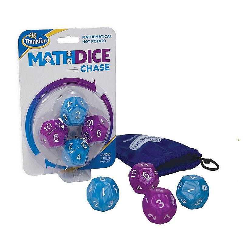 One part hot potato, one part math. Math Dice Chase tests your ability to quickly do mental math. Hurry to roll the dice, call out your answer, and pass the dice before you get caught with a second pair in front of you!