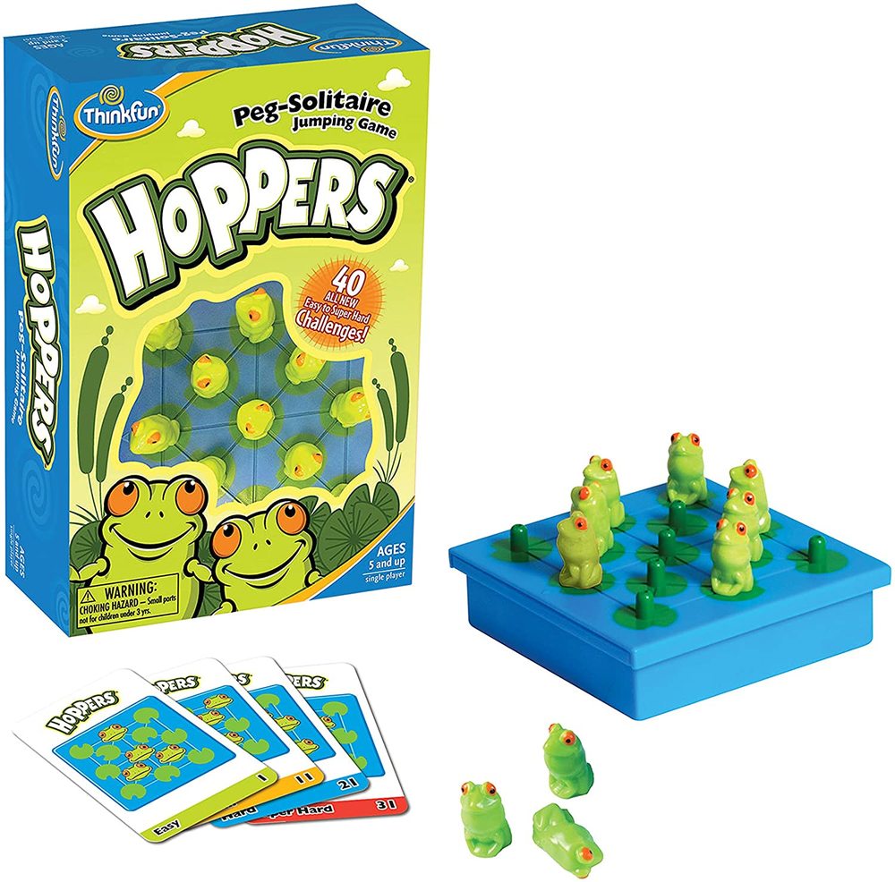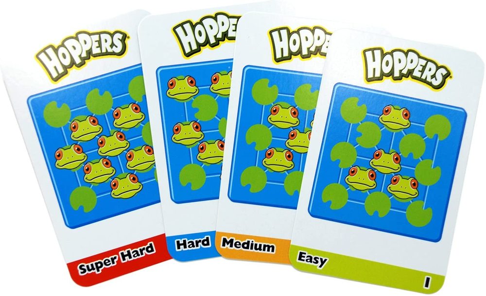 Hoppers is a peg solitaire jumping game - set the frogs on the pond, then jump the frogs until only one is left standing. Forty challenge cards range from easy to super hard. In this version of Hoppers, the challenges were created specifically for younger players. Start simple and grow your skills with each level. In no time at all you'll be the smartest frog in the pond!