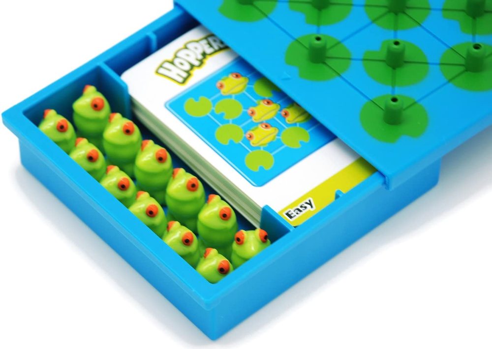 - Includes game grid with storage drawer, 40 challenges and solutions, and 12 green hopper frogs. It's classic peg solitaire, with a fun frog theme.