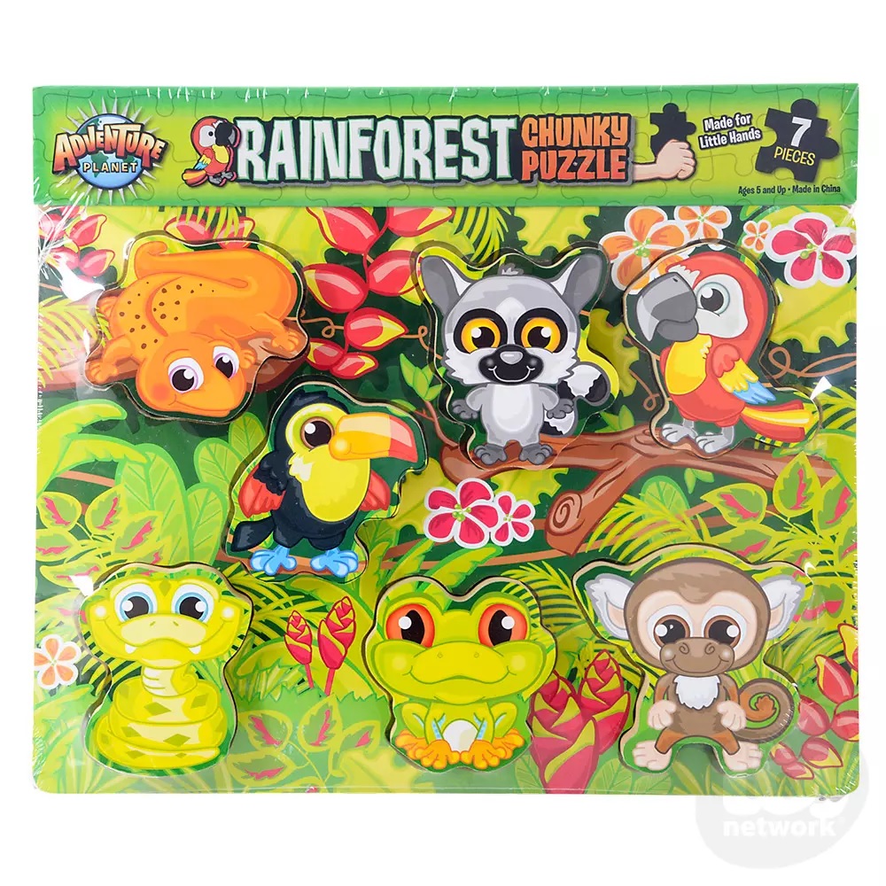 Jump into the jungle with this 7 Piece Chunky Rainforest Puzzle. The colorful rainforest characters and chunky, durable pieces make this brain game perfect for active minds! Wooden puzzle pieces. Includes informative blurbs on back of packaging. Learn the beginnings of simple mechanics. Develop visual skills, color recognition, logic, and coordination. Approximately 11.5in. x 8.5in.