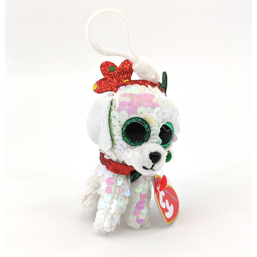 Sugar is simply irresistible! In this case, Sugar is an adorable, mini stuffed animal wearing a festive antler headband. Clip her on your purse or backpack so she can tag along with you throughout the holiday season. She loves to have her hand-sewn reversible sequins brushed to magically change her look.