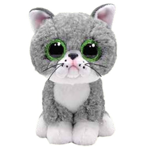 Fergus is a grey cat with a white face, paws and belly. He has large, glittery green button eyes, a black nose and black thread whiskers. He has a Persian cat/brachycephalic style of face with pink airbrushing details on his mouth.
