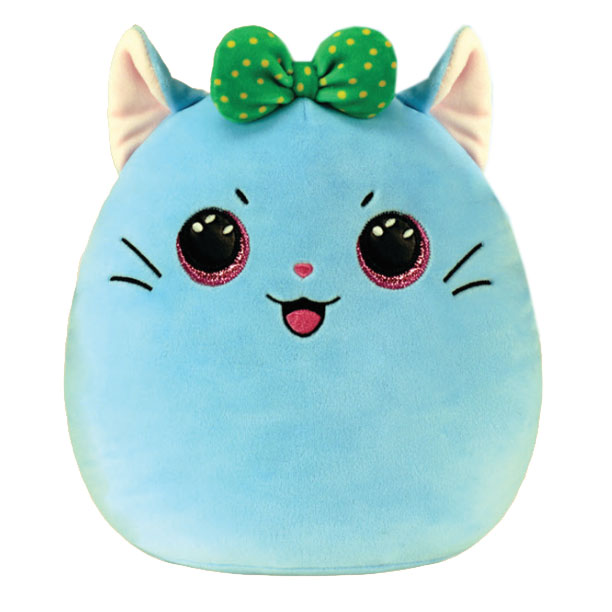 Kirra is a round, squishy, blue cat with sparkly pink eyes, a pink nose and black whiskers. She wears a green ribbon on top of her head covered in white spots.