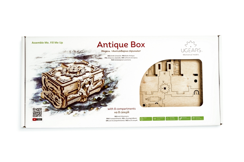 As with all Ugears models, The Antique box comes in plywood boards with pre-cut details that you will assemble with your own hands. The assembly process is simple and fun: everything you need to know to put the model together is in a detailed illustrated step-by-step instruction manual in 11 languages. It also doesn’t need any glue or additional tools for assembly.