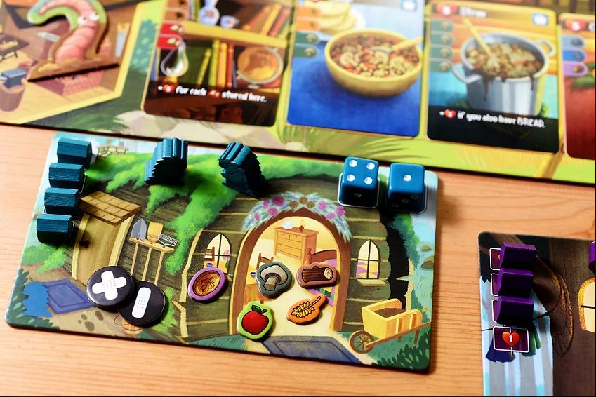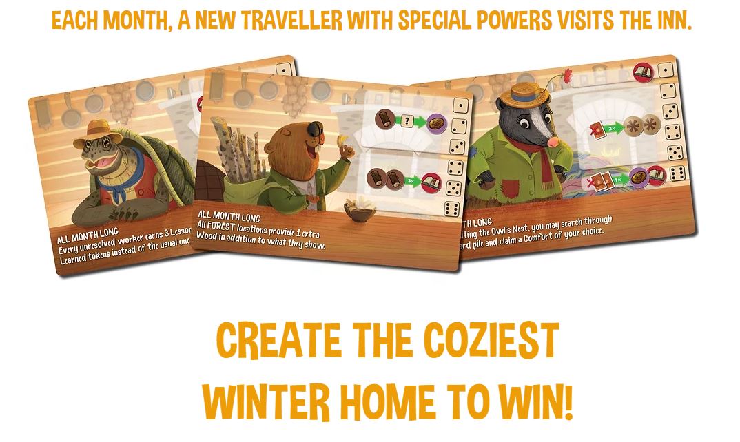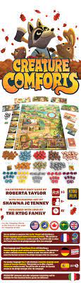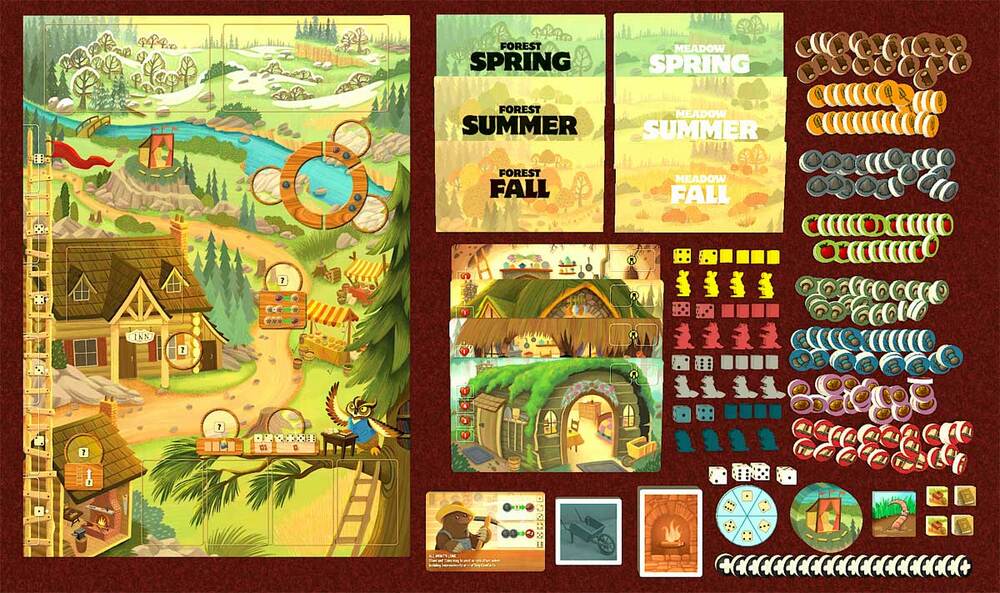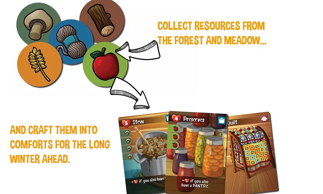 In Creature Comforts, you spend the Spring, Summer, and Fall gathering different goods from the forest and spending them to collect items that will make your home more inviting while the world outside is covered in a layer of snow. Each round you send family members out to various locations in an attempt to gain supplies. If they fall short of their goal, they’ll learn a lesson and be better prepared next time. The family that has created the most comfortable den wins the game.