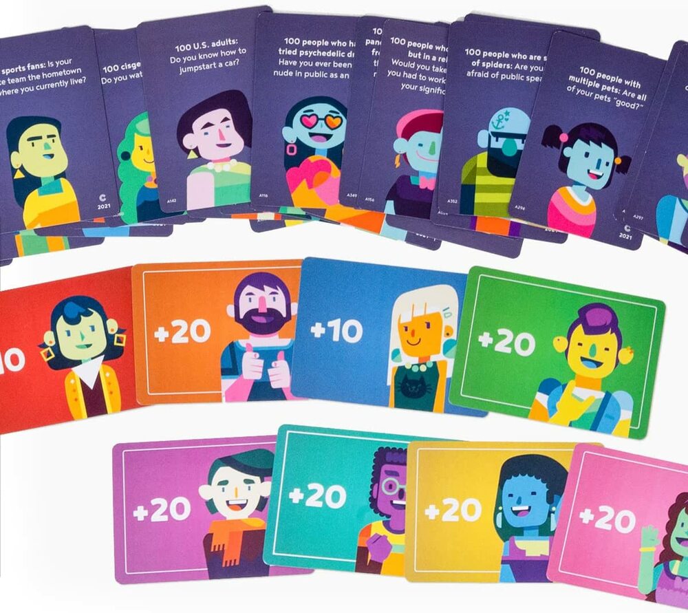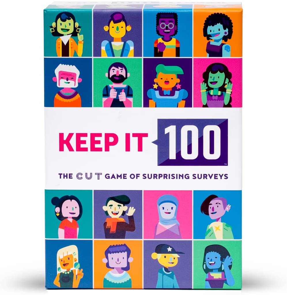 Hundreds of surveys. 100 people each. How did people answer? You have to guess. Every time you’re right, your card is added to the line, making the next guess trickier. Raise the stakes by betting points on whether the other players’ guesses are correct. Highly replayable with tons of opportunities for future expansion. Can you Keep it 100?