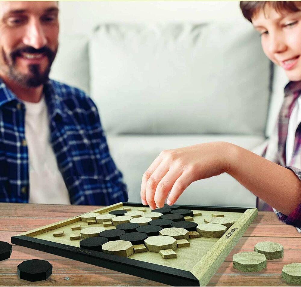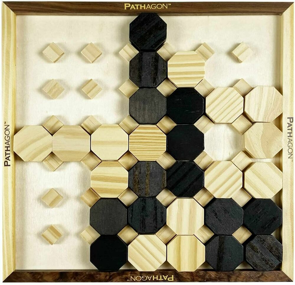 Pathagon is an ever changing strategy game of building paths. Players take turns placing their wooden game pieces on the board in an attempt to build a path from one side of the game board to the other. There is a "trapping" move that allows a player to "trap" and remove one of their opponents game pieces from the board. The first player to complete the path wins.