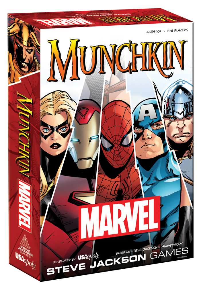 Munchkin Marvel Edition, an all-new Munchkin game that fuses the classic card game fun of monster-slaying and role-playing with the most iconic characters from the Marvel universe. Created under license from Steve Jackson Games and in conjunction with Marvel, Munchkin Marvel Edition comes complete with new monsters (villains), allies (heroes) and custom S.H.I.E.L.D. Identification Cards, and is the perfect gift for Munchkin fans who are ready for an epic Marvel battle!