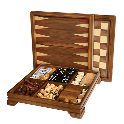 Includes cribbage board with metal pegs, playing cards, wooden checkers, dominoes, dice & doubling cube and dice cups