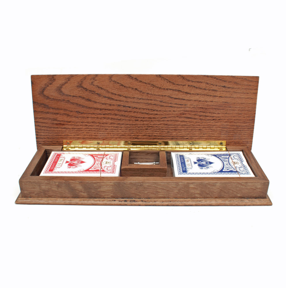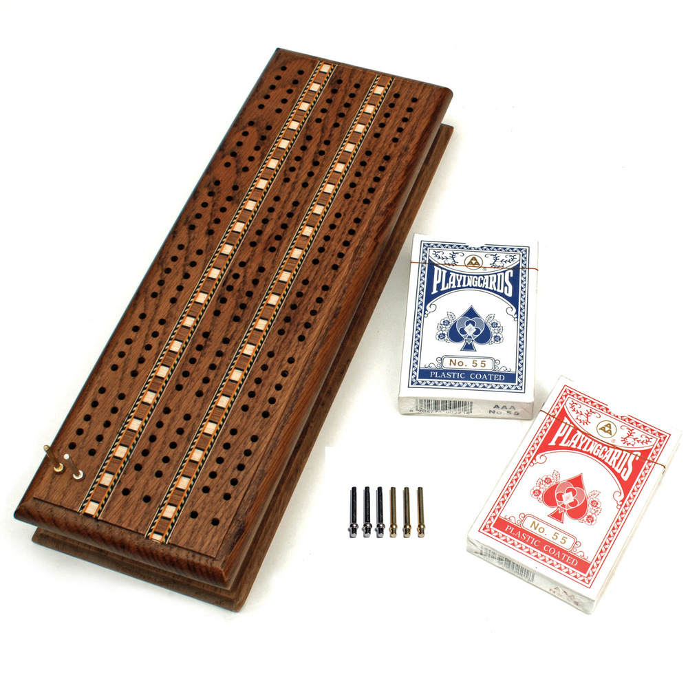 One of our most exclusive cribbage sets! This deluxe medium stained solid oak 3-Track is cherished for its beautifully stained oak wood and skillfully crafted inlays. Also features space for storing the 2 decks of cards and 6 metal pegs when not in use. A cribbage set to pass down from one generation to the next!