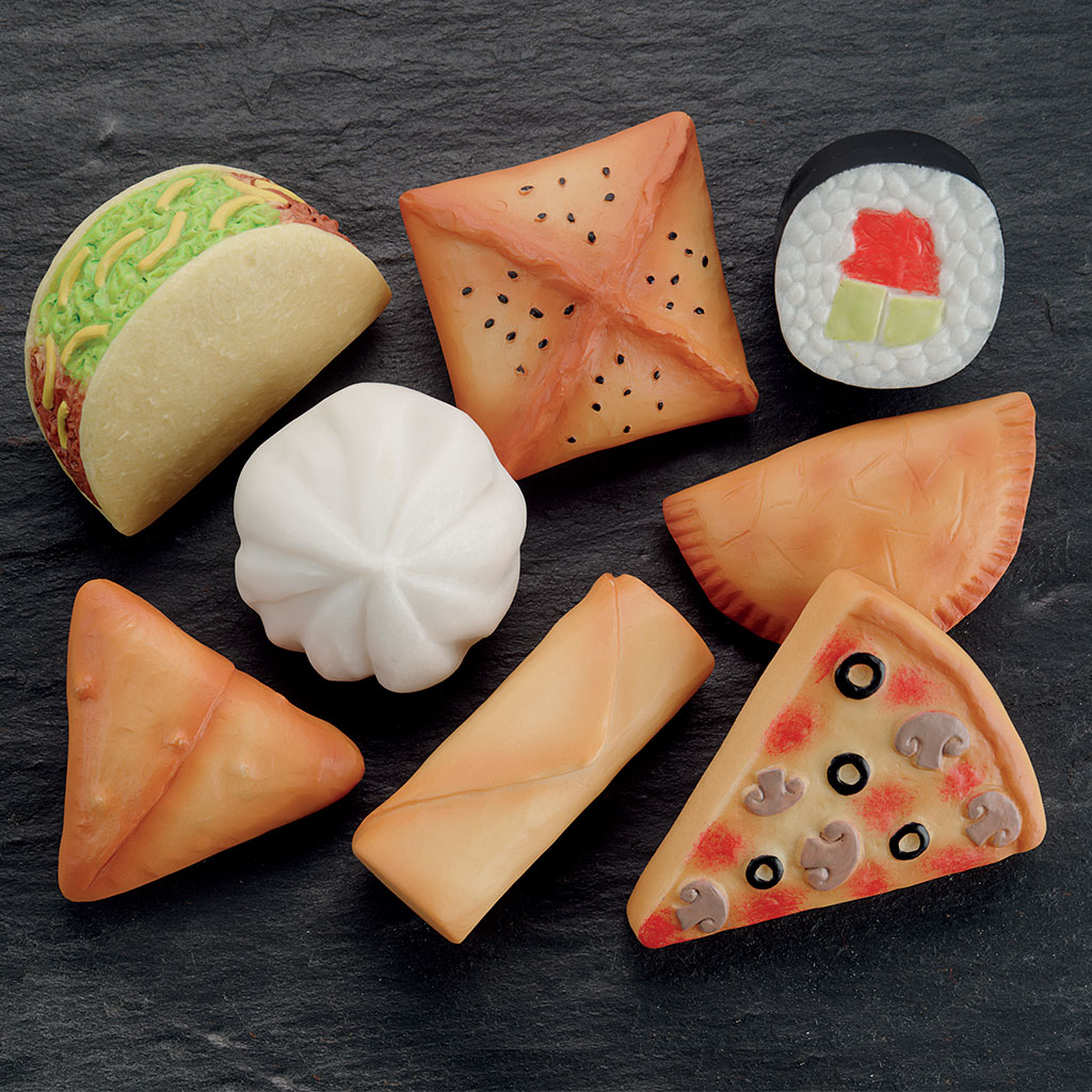 These fascinating food stones are an ideal multicultural resource, helping children to learn more about different cultures and their culinary heritage. Durable for use outdoors all-year-round, children will love using them in their play as inspiration for muddy feasts and global food festivals. The set contains eight foods: bao bun, empanada, kalitsounia, pizza, samosa, spring roll, sushi, and taco. For children ages 2 years and older.