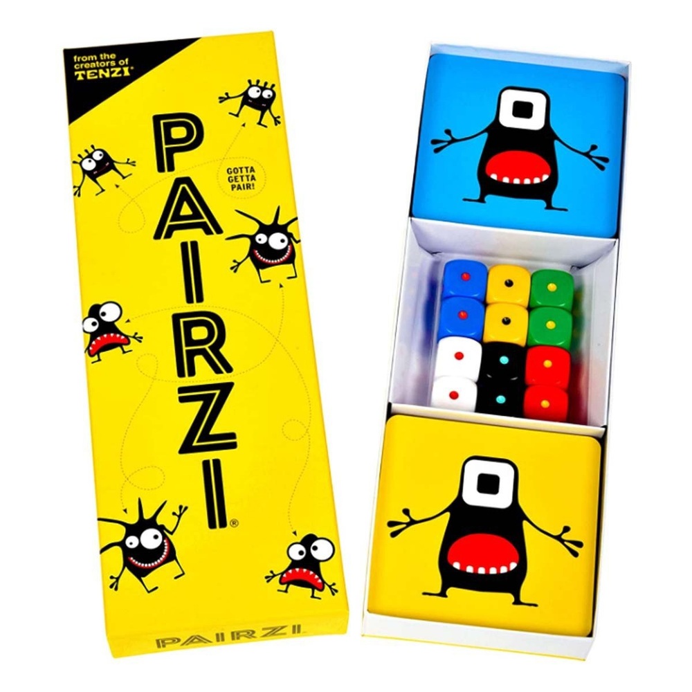 Roll a pair, find a pair, be faster than all others there. PAIRZI is the newest creation from the duo that brought you TENZI, SLAPZI, and ITZI. PAIRZI is an easy to learn, fast-paced, card-matching game with a twist that creates playful competition and unavoidable laughter. PAIRZI is all about speed. Be the first to find matching pairs of Critter Cards to win! Here’s the twist, before you can look for Critter Cards you must roll a pair with your dice, two 3’s for example. Roll a pair, find a pair, repeat. There’s not just one way to play PAIRZI, that’s why we’ve included instructions for 5 different PAIRZI games including PUSHOUT PAIRZI, SNAKE EYES PAIRZI, and PARTNER PAIRZI. The games are played the same whether you use the multi-colored Critters Cards or if you prefer more of a challenge and use the yellow Critter Cards. PAIRZI is a great choice for your next family game night, birthday party, sleepover, road trip, or any other time you’re looking for fun, fast-paced entertainment. Teachers love it for early finishers and team building activities too.